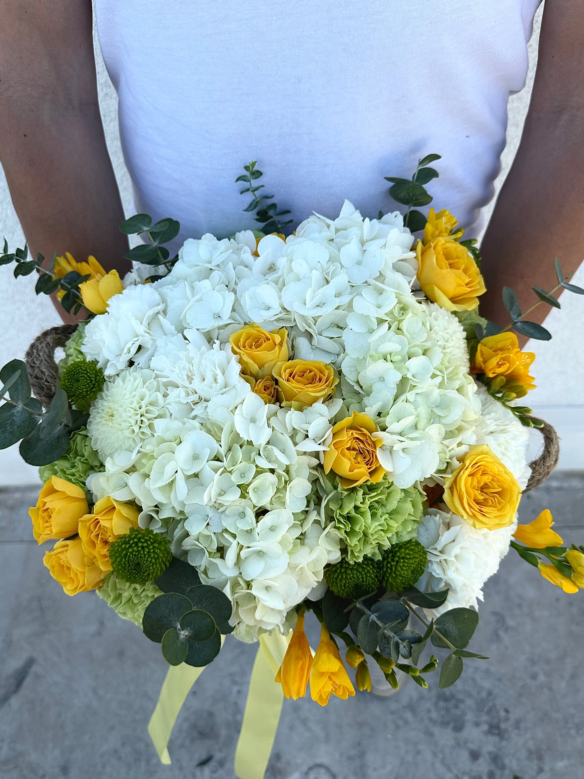 Our stunning basket bouquet features a delightful mix of white hydrangeas, vibrant yellow roses, eucalyptus, and playful billy buttons, creating a fresh, cheerful arrangement perfect for any occasion. Available in three sizes to suit your needs, this basket starts at $175 and brings a touch of nature’s charm into your home or event. Whether you're celebrating a special occasion or sending a thoughtful gift, this bouquet is freshly arranged with care and delivered right to your door. Its blend of lush greenery and vivid blooms offers the perfect balance of elegance and rustic beauty.